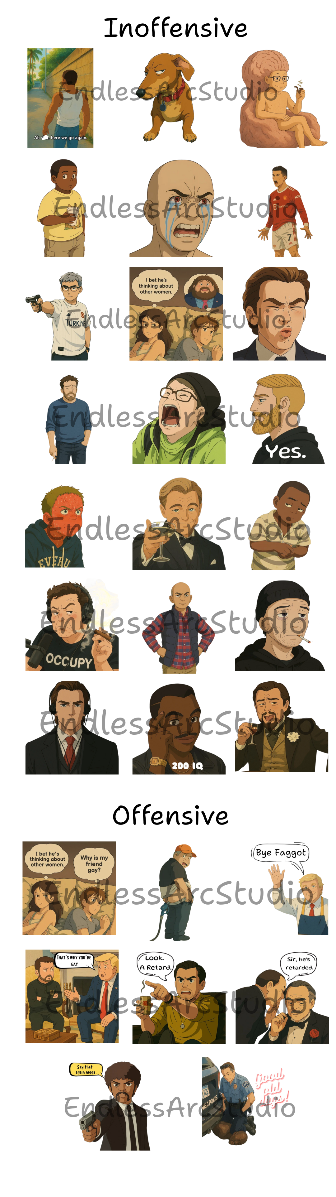 Get ready to spice up your chats with this 30-Sticker Meme Pack! Inside, you’ll find 8 bold, offensive stickers with text—perfect for those savage clapbacks and unfiltered moments (warning: not for the faint-hearted!). Paired with 22 chill, normal stickers, this pack offers a versatile mix of humor, sass, and everyday vibes. All stickers are crafted in crisp 512x512 webp format, ready to dominate your Telegram and WhatsApp conversations. Whether you’re roasting friends or keeping it casual, this pack’s got you covered—download now and unleash the chaos!